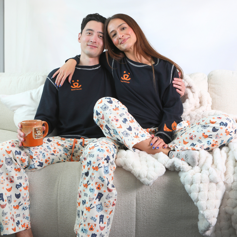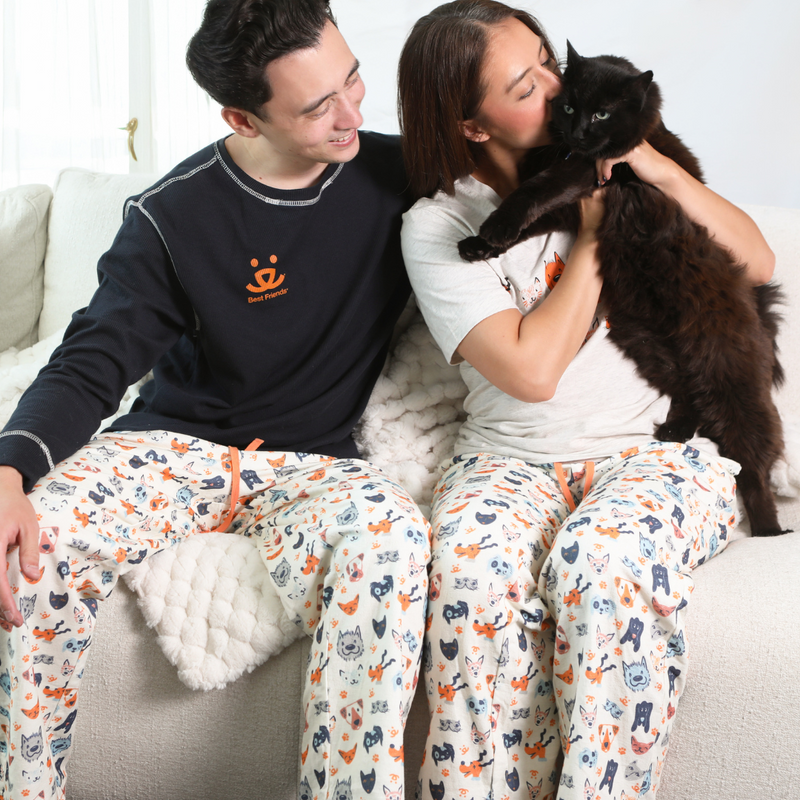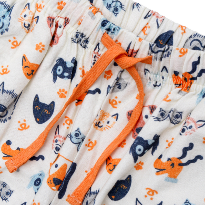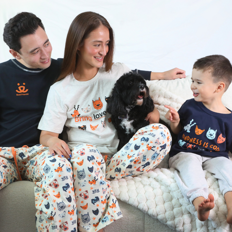 Get cozy in these ultra-soft, 100% cotton flannel pajama pants featuring a whimsical all-over dog and cat print that's as fun as it is comfy. Designed with side pockets, an adjustable contrast drawstring and a straight leg for a relaxed fit, these pants are available in sizes ranging from XS to 4XL. Perfect for lounging, gifting, or matching with your pack! Pair it with our Kindness Sweatshirt or our new Furry Friends Thermal! Also pictured: our coordinating Furry Friends Shirt for kids and our Bring Love Home shirt.