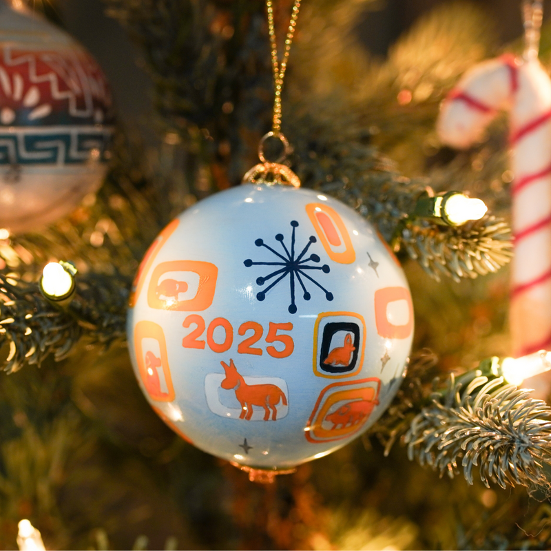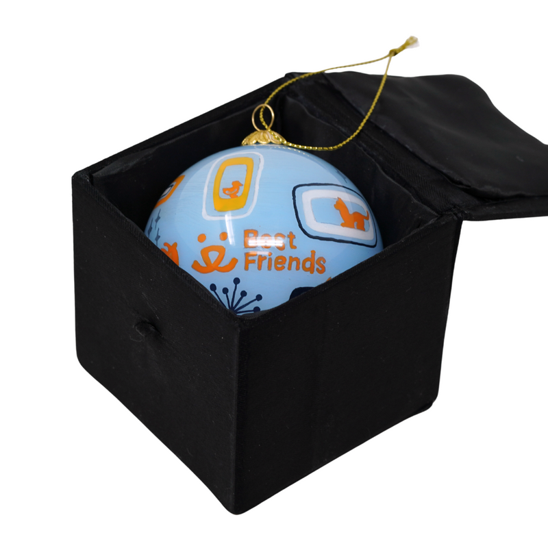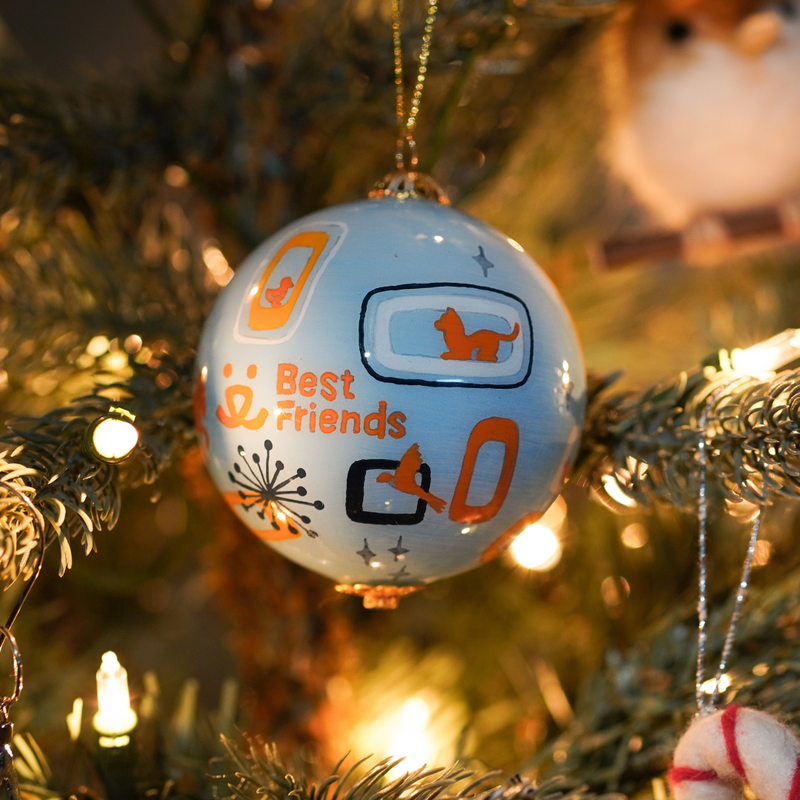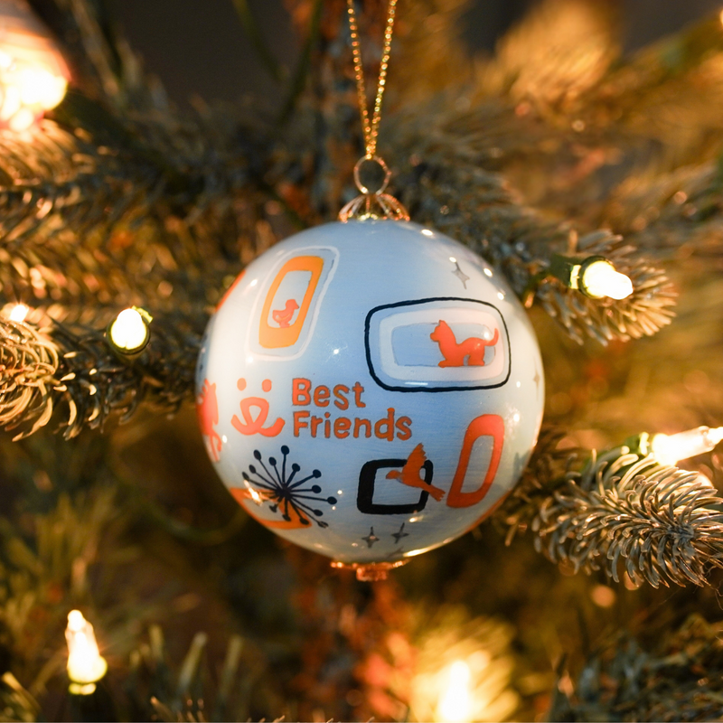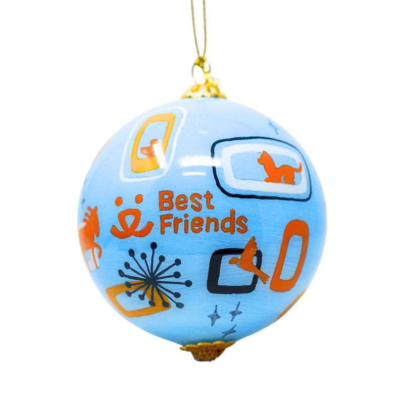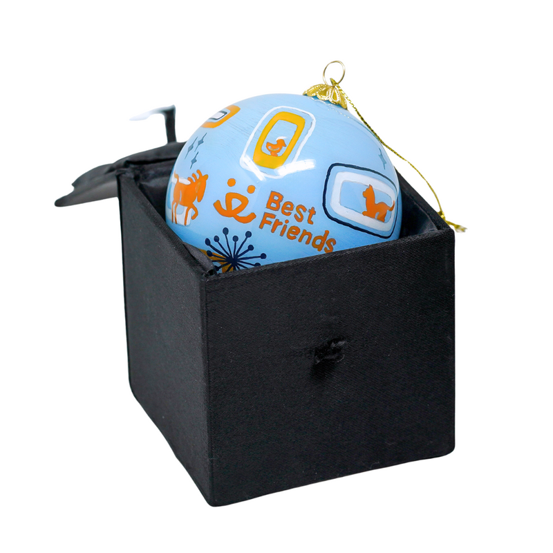 This year’s design features playful silhouettes of cats and dogs in a retro mid-century style, paired with the signature Best Friends orange logo. Carefully crafted by skilled artisans using the ancient tradition of reverse glass painting (Li Bien style), each ornament is a unique and timeless keepsake.