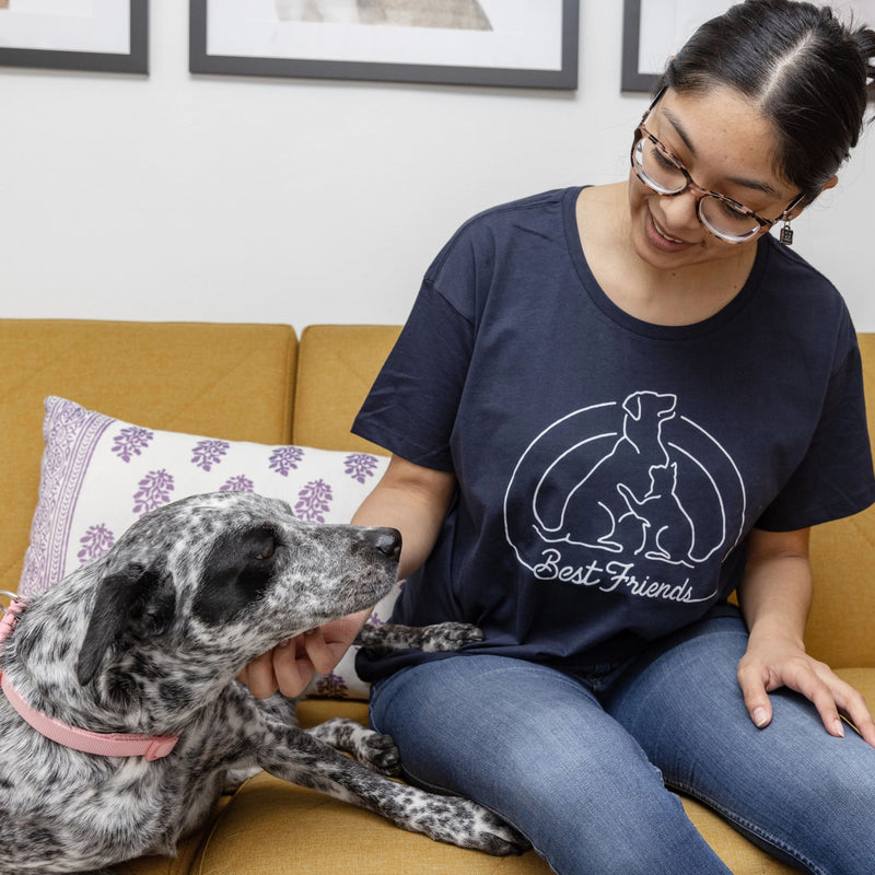 Hi there! Thank you for taking the time to leave a review. We're so glad to hear that you love our Best Friends Stamp T-Shirt and that it represents your love for animals. - Kari