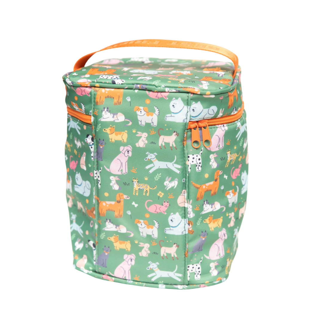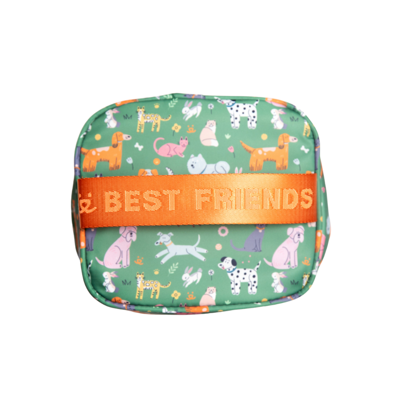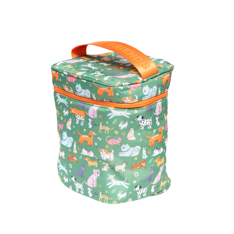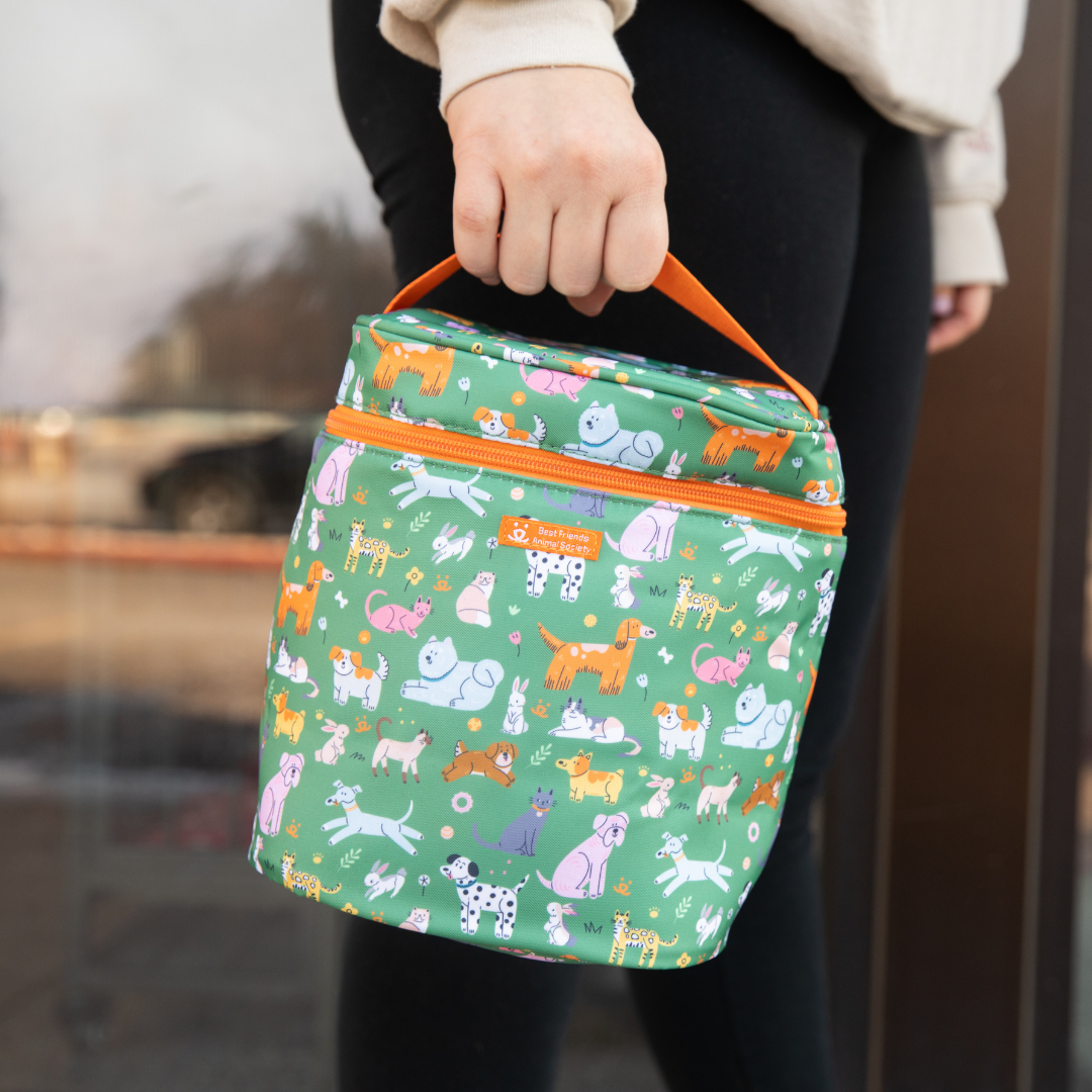 Designed with a taller shape to comfortably fit drinks, this compact cooler is both practical and stylish. It features an adorable all-over dog-and-cat pattern in green, plus a sturdy carry handle embossed with “Best Friends”—a subtle detail that makes it extra special.