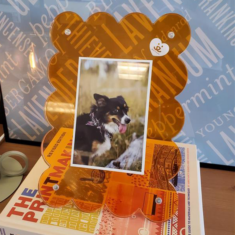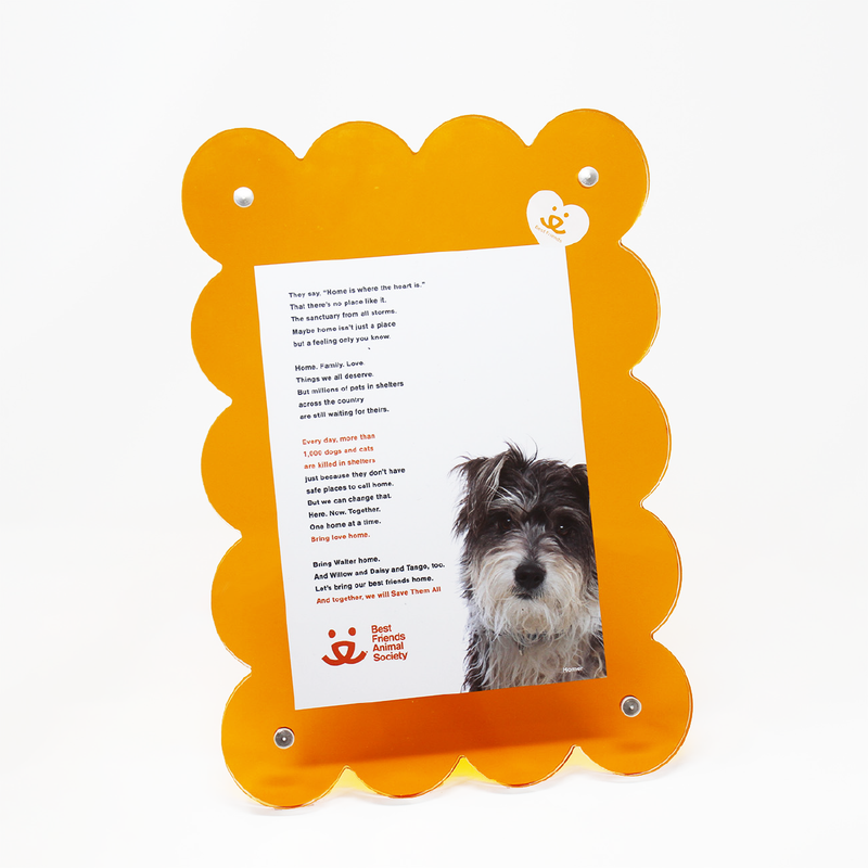 Add a touch of charm and vibrancy to your space with this vibrant orange lucite frame. But it's more than that. It's a celebration of memories, a support for animal welfare, and a colorful addition to your home decor. Whether as a gift for a friend or a treat for yourself, this frame will surely bring joy and warmth to any room. This two piece frame consists of an orange lucite back and a clear lucite front that snap together by four corner magnets. The two-piece frame allows for flexibility to showcase a variety of sizes of photos in either portrait or landscape format up to 5"x7".