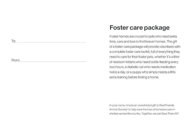 Foster homes are crucial for pets who need extra time, care and love to find forever homes. The gift of a foster care package provides volunteers with a complete foster care toolkit, full of everything they need to care for their foster pets, whether it’s a litter of newborn kittens who need bottle-feeding every two hours, a diabetic cat who needs medication twice a day, or a puppy who simply needs to learn some basic manners before finding a permanent home.