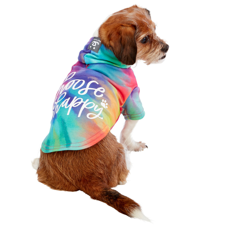 Bring the good vibes to every walk! This rainbow tie-dye hoodie wraps your pup in ultra-soft fleece and a “Choose Happy” back print—because wagging tails and bright colors are a perfect match.