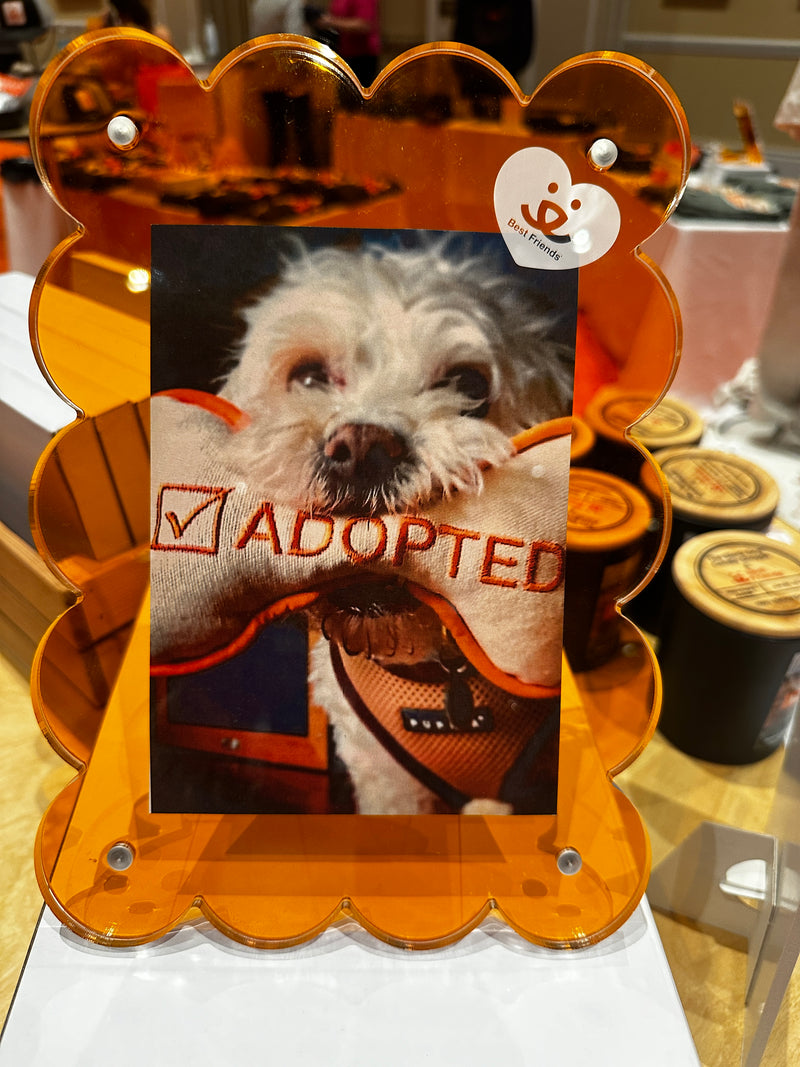 Add a touch of charm and vibrancy to your space with this vibrant orange lucite frame. But it's more than that. It's a celebration of memories, a support for animal welfare, and a colorful addition to your home decor. Whether as a gift for a friend or a treat for yourself, this frame will surely bring joy and warmth to any room. This two piece frame consists of an orange lucite back and a clear lucite front that snap together by four corner magnets. The two-piece frame allows for flexibility to showcase a variety of sizes of photos in either portrait or landscape format up to 5"x7".