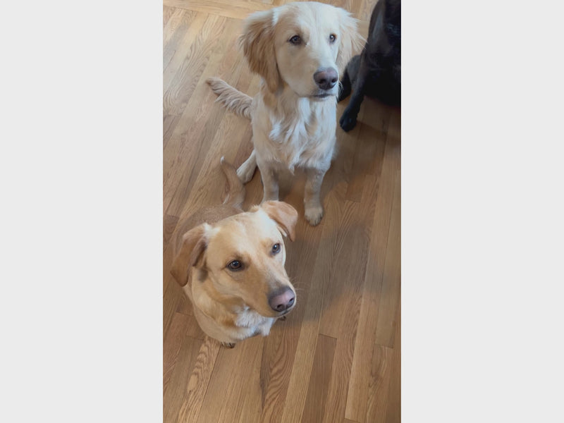 Video details: Mac the golden baby, Boone the blonde boy, and Tucker the sweet senior black lab mix are seen playing with the I'm Adopted Dog Toy in size large!
