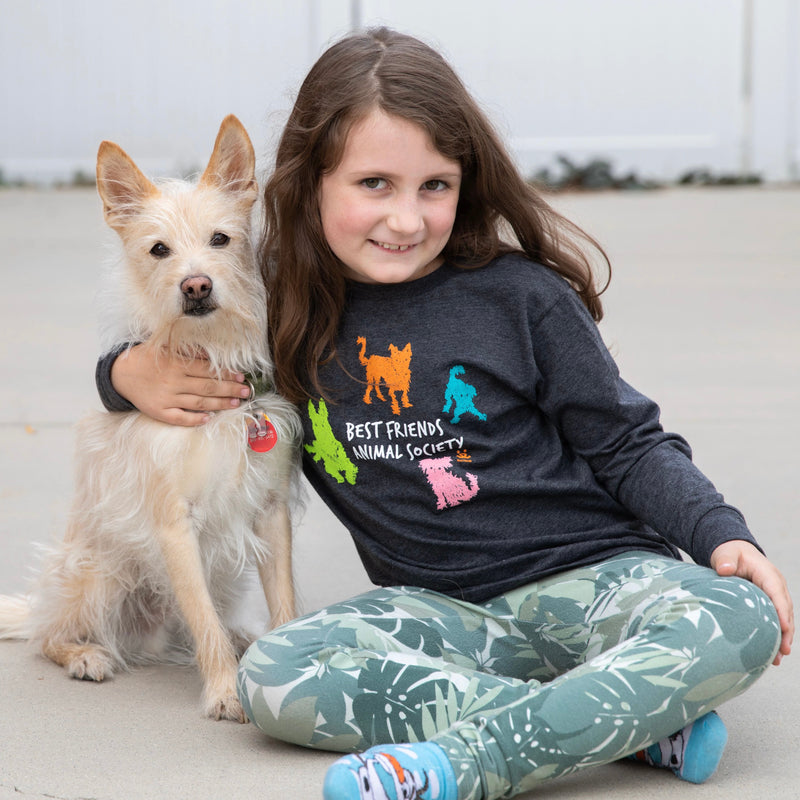 We appreciate you taking the time to post such a thoughtful review! Your son looks adorable in his new Scribble Dog Youth Long Sleeve, and we're glad to hear you are both loving it. Thank you for supporting the animals at Best Friends Animal Society with your purchase, as 100% of the proceeds go right back into the lifesaving work to help Save Them All!!