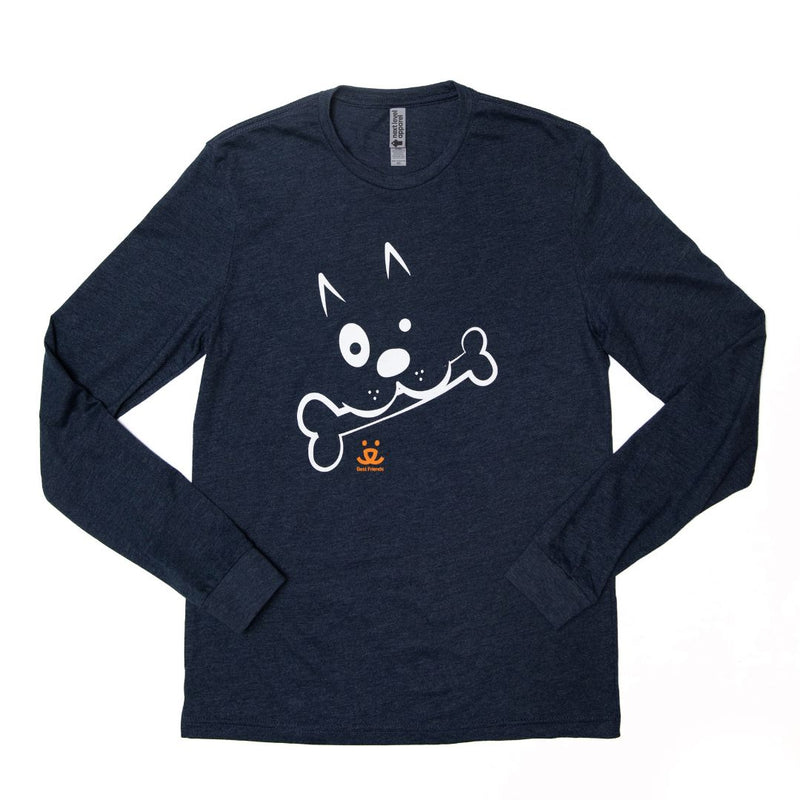 ¡Demuestra tu amor por los cachorros con estilo con esta divertida camiseta de manga larga! Con un adorable dibujo de una carita de perro mordiendo un hueso, esta camiseta burdeos intenso es suave, ligera y de corte holgado.