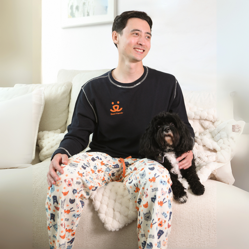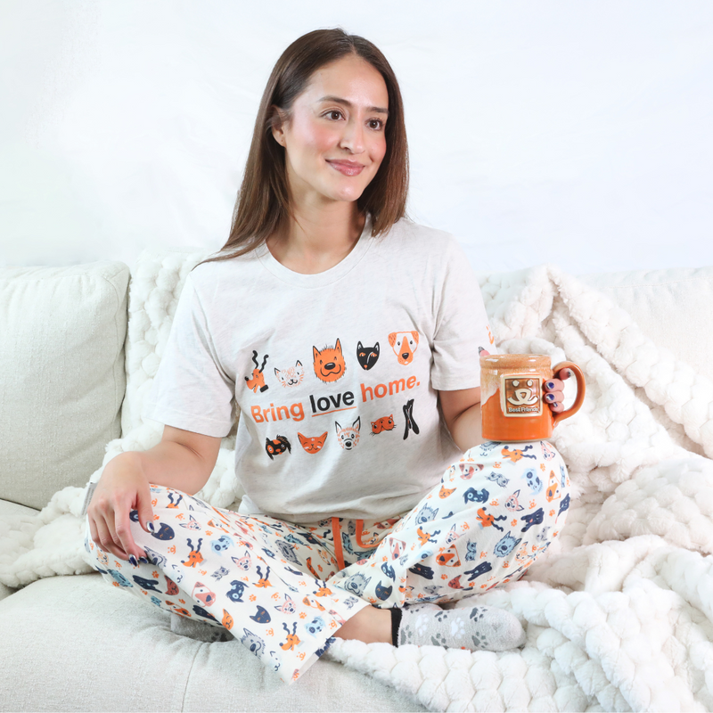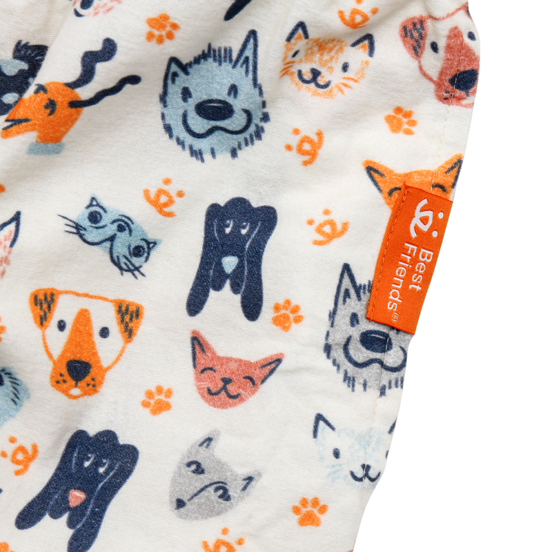 Get cozy in these ultra-soft, 100% cotton flannel pajama pants featuring a whimsical all-over dog and cat print that's as fun as it is comfy. Designed with side pockets, an adjustable contrast drawstring and a straight leg for a relaxed fit, these pants are available in sizes ranging from XS to 4XL. Perfect for lounging, gifting, or matching with your pack! Pair it with our Kindness Sweatshirt or our new Furry Friends Thermal! Also pictured: our coordinating Furry Friends Shirt for kids and our Bring Love Home shirt.