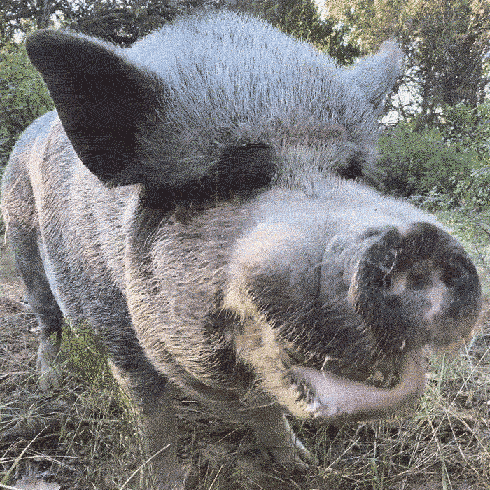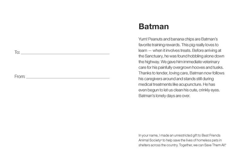 Este guerrero encapuchado necesitó un poco de ayuda cuando llegó a Best Friends en 2018. Lo vieron caminando por la carretera, lo recogieron y lo llevaron a una vida mejor en el Santuario. Al llegar, Batman necesitó atención médica inmediata para sus pezuñas y colmillos demasiado grandes para poder recuperar su audacia. Actualmente, se ha retirado de las hazañas heroicas y ahora es voluntario como el recepcionista oficial de cerdos en Best Friends.