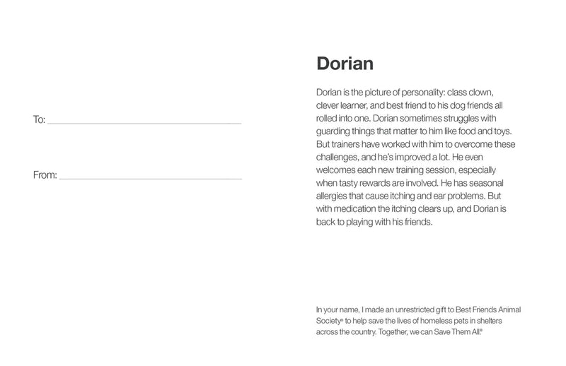 Dorian es la imagen de la personalidad.: payaso de clase, estudiante inteligente, Y el mejor amigo de sus amigos perros, todo en uno. A Dorian a veces le cuesta proteger cosas importantes para él, como la comida y los juguetes. Pero los entrenadores han trabajado con él para superar estos desafíos., y Él es Ha mejorado mucho. Incluso agradece cada nueva sesión de entrenamiento, sobre todo cuando hay recompensas deliciosas.. Tiene alergias estacionales que le provocan picazón y problemas de oído.. BPero con medicación la picazón desaparece., y Dorian vuelve a jugar con sus amigos.