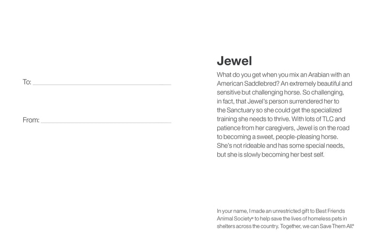 ¿Qué se obtiene al cruzar un caballo árabe con un Saddlebred americano? Un caballo extremadamente hermoso y sensible, pero desafiante. Tan desafiante, de hecho, que la persona de Jewel la entregó al Santuario para que recibiera el entrenamiento especializado que necesita para prosperar. Con mucho cariño y paciencia de sus cuidadores, Jewel está en camino de convertirse en un caballo dulce y complaciente. No es montable y tiene algunas necesidades especiales, pero poco a poco está alcanzando su mejor versión.