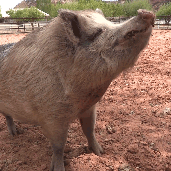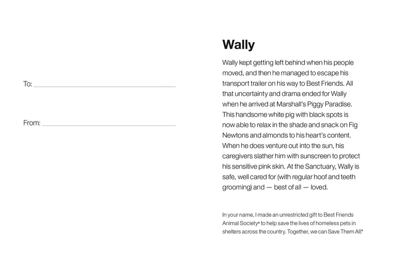 Wally se quedaba atrás una y otra vez cuando su gente se mudaba, y luego logró escapar de su remolque de transporte camino a Best Friends. Toda esa incertidumbre y drama terminó para Wally cuando llegó a... El paraíso de los cerditos de MarshallEste hermoso cerdo blanco con manchas negras ahora puede relajarse a la sombra y comer Fig Newtons y almendras a su antojo. Cuando sale al sol, sus cuidadores le aplican protector solar para proteger su sensible piel rosada. En el Santuario, Wally está a salvo, bien cuidado (con cepillado regular de pezuñas y dientes) y, lo mejor de todo, querido.