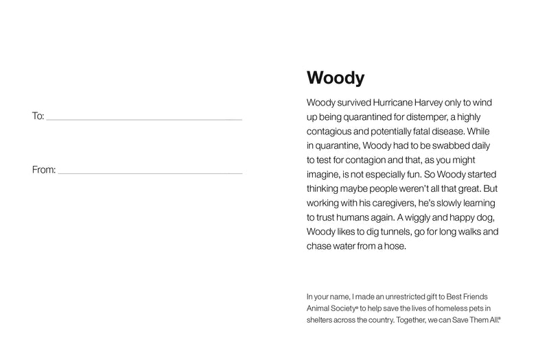 Woody sobrevivió al huracán Harvey solo para terminar en cuarentena por moquillo, una enfermedad altamente contagiosa y potencialmente mortal. Durante la cuarentena, Woody tuvo que hacerse hisopados a diario para detectar contagios, y eso, como se imaginarán, no es nada divertido. Así que Woody empezó a pensar que quizás la gente no era tan buena. Pero, trabajando con sus cuidadores, poco a poco está aprendiendo a confiar de nuevo en los humanos. Woody, un perro inquieto y feliz, disfruta cavando túneles, dando largos paseos y buscando agua con una manguera.