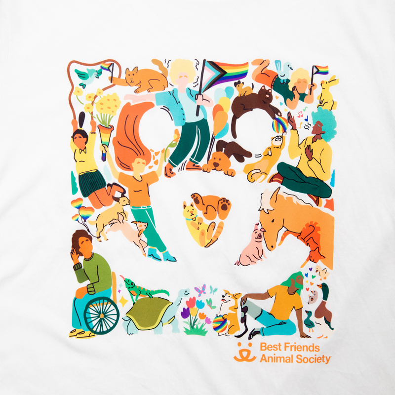 Un sincero reconocimiento a Raf, el talentoso artista y exmiembro del equipo de Best Friends, creador del diseño de la camiseta del Orgullo de este año. También agradecemos a nuestro panel de revisión y votación LGBTQ+, compuesto por 13 miembros del equipo, por sus contribuciones.