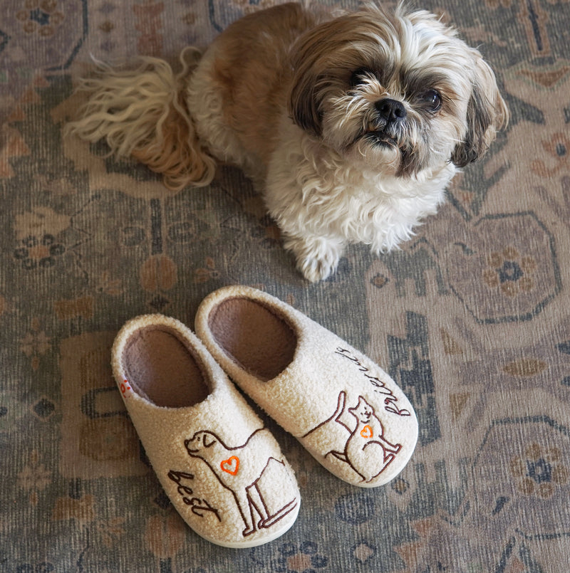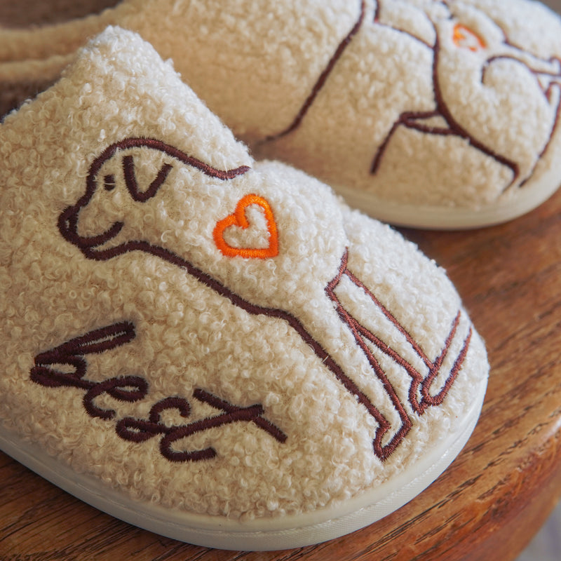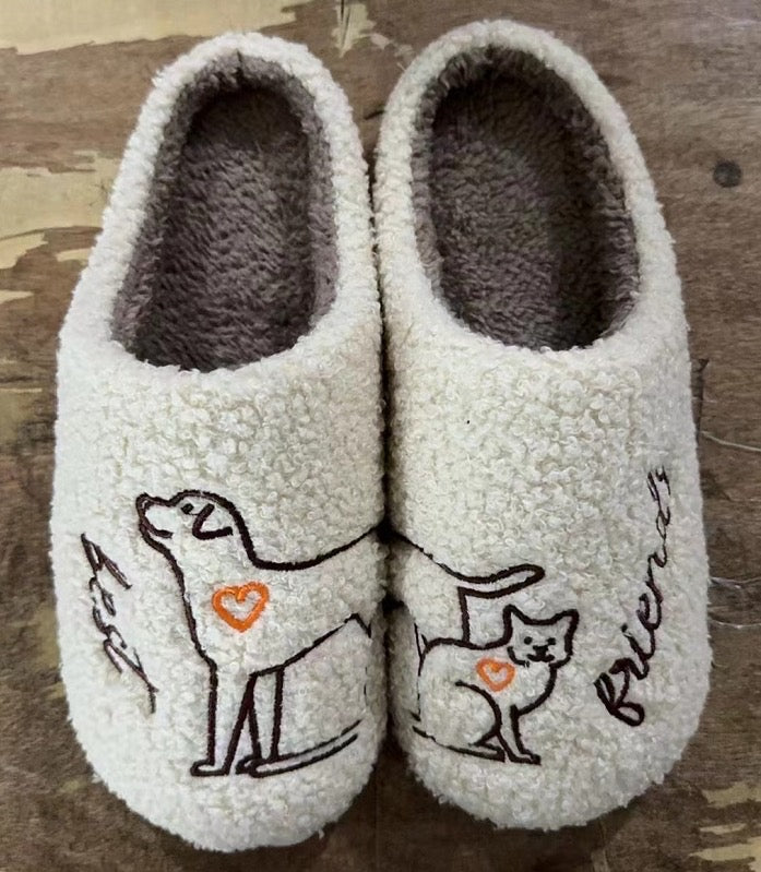 Acurrúcate con estas adorables pantuflas con temática de mascotas, perfectas para amantes de perros y gatos. Hechas de suave felpa, estas pantuflas presentan encantadores diseños bordados: un perro y un gato juguetones, cada uno con un pequeño corazón, que simboliza el amor por tus peludos amigos. La suela acolchada garantiza comodidad para el día a día, mientras que su diseño sin cordones facilita su uso después de un largo día.