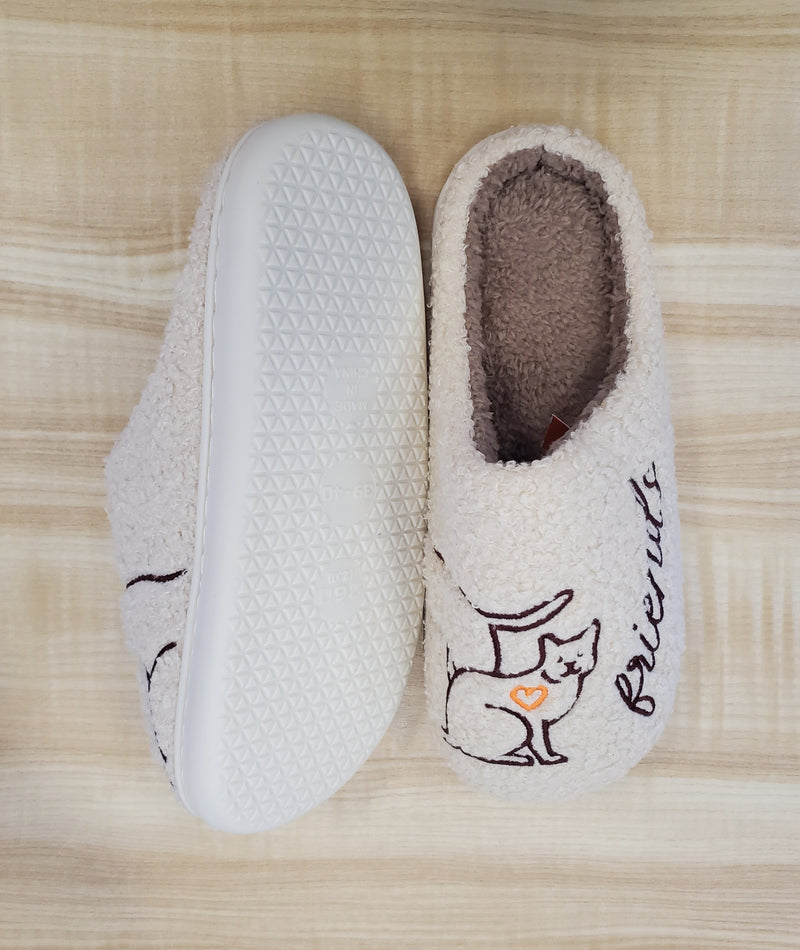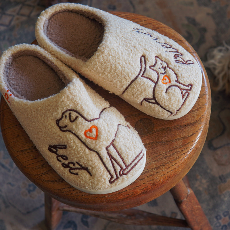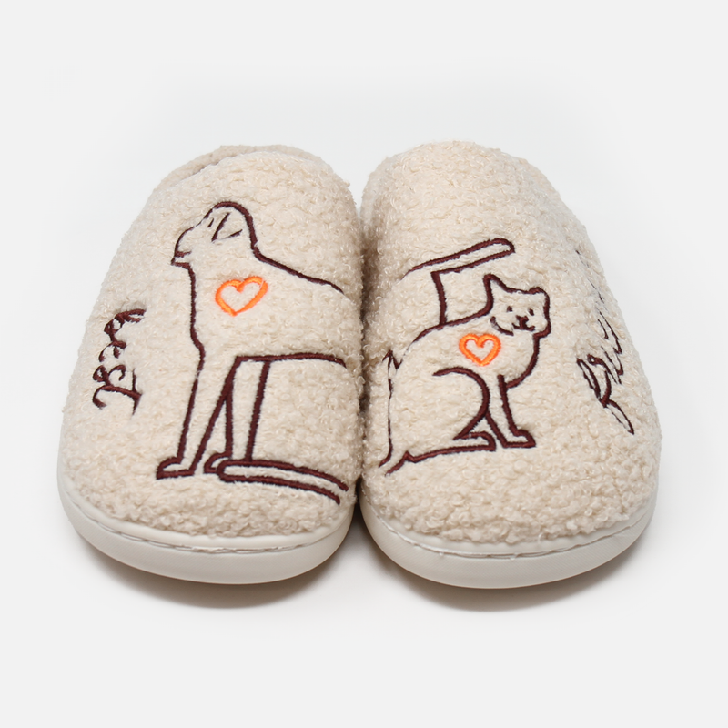 Acurrúcate con estas adorables pantuflas con temática de mascotas, perfectas para amantes de perros y gatos. Hechas de suave felpa, estas pantuflas presentan encantadores diseños bordados: un perro y un gato juguetones, cada uno con un pequeño corazón, que simboliza el amor por tus peludos amigos. La suela acolchada garantiza comodidad para el día a día, mientras que su diseño sin cordones facilita su uso después de un largo día.