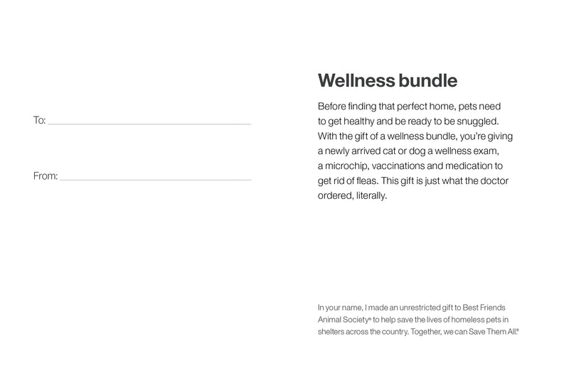 Antes de encontrar el hogar perfecto, las mascotas necesitan estar sanas y listas para recibir mimos. Con un paquete de bienestar, le regalas a tu gato o perro recién llegado un examen de bienestar, un microchip, vacunas y medicamentos antipulgas. Este regalo es justo lo que recetó el médico, literalmente.