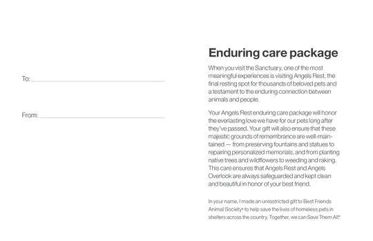 Thank you so much for your generous gift for the Angels Rest Enduring Care Package! We are so grateful for your dedicated to support Best Friends Animal Society as we all work together to Save Them All.