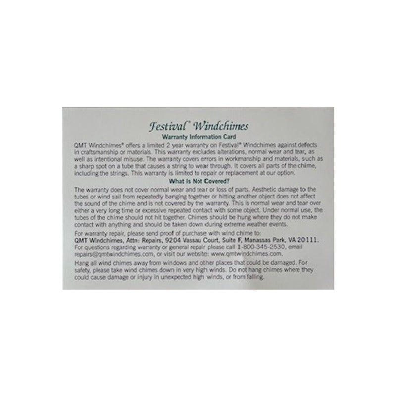 For warranty repair, please send proof of purchase with wind chime to: QMT Windchimes, Attn: Repairs, 9204 Vassau Court, Suite F, Manassas Park, VA 20111.